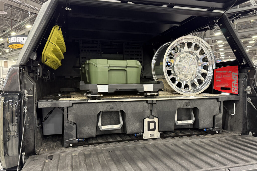 Overland Vehicle Systems supplied the composite truck topper, which provides a durable, sealed workspace. ICON plans to mount nitrogen tanks and tools inside, while a DECKED drawer system keeps gear organized. A massive slide-out tray offers room for a fridge or cooler, making it invaluable during long days of testing and tuning.