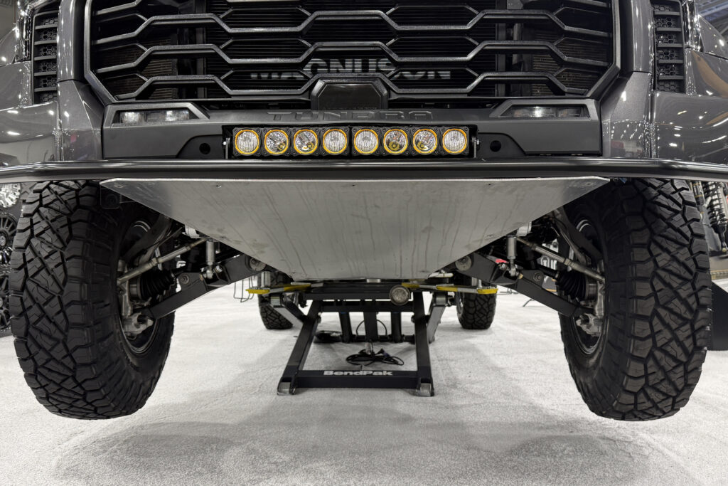 There’s nothing subtle about the 2022 Toyota Tundra dominating the ICON Vehicle Dynamics section of the Randy’s Worldwide booth at the 2025 SEMA Show. Wide fiberglass fenders, towering 38-inch tires, a wall of KC lighting, and serious long-travel hardware on full display make it clear this isn’t a parts catalog prop or a mild weekend wheeler. It’s an unapologetically aggressive, fully functional off-road development platform — one that has spent the past several years being pushed to the limit as ICON’s flagship R&D mule for the newest-generation Tundra.