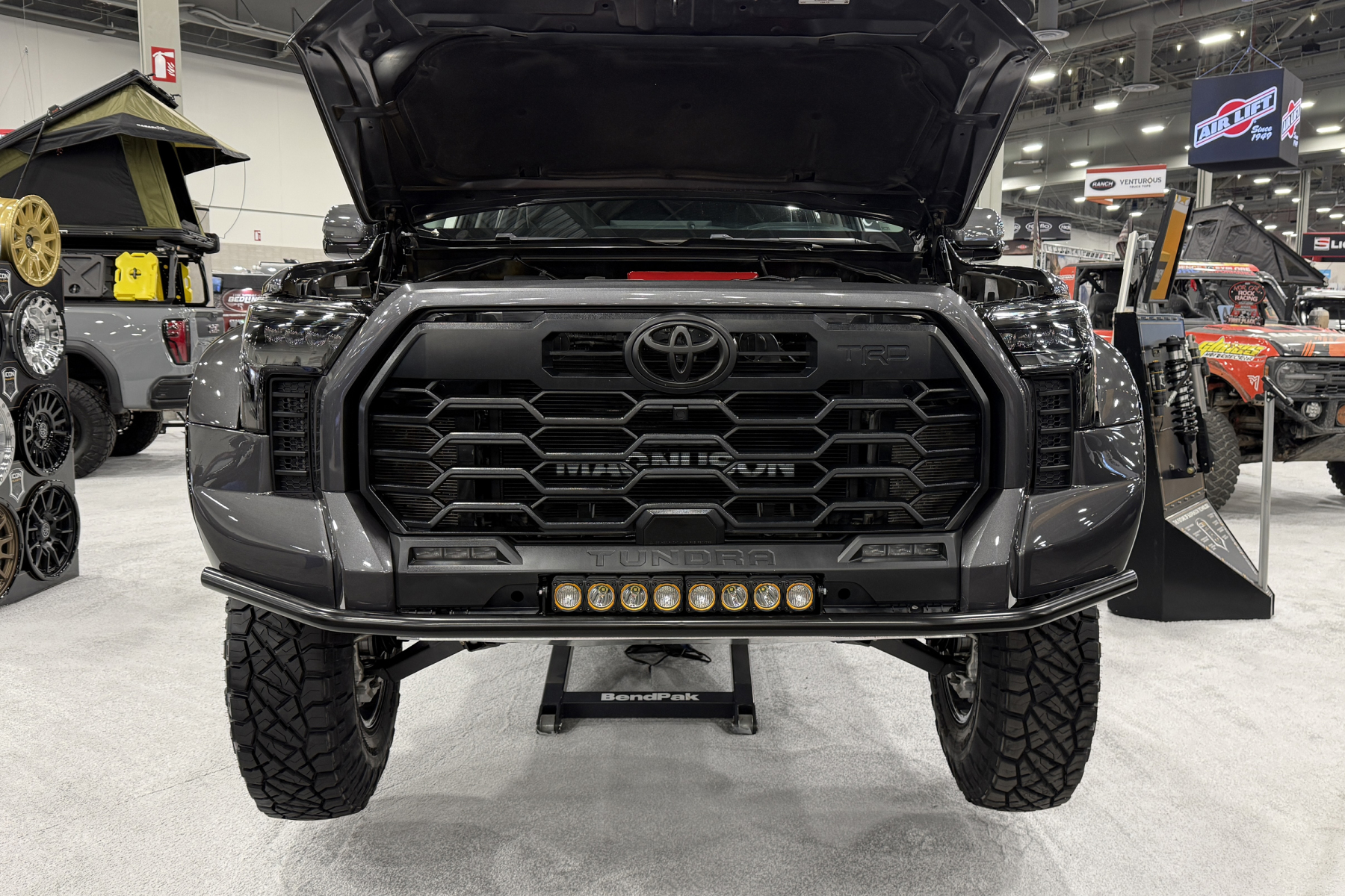There’s nothing subtle about the 2022 Toyota Tundra dominating the ICON Vehicle Dynamics section of the Randy’s Worldwide booth at the 2025 SEMA Show. Wide fiberglass fenders, towering 38-inch tires, a wall of KC lighting, and serious long-travel hardware on full display make it clear this isn’t a parts catalog prop or a mild weekend wheeler. It’s an unapologetically aggressive, fully functional off-road development platform — one that has spent the past several years being pushed to the limit as ICON’s flagship R&D mule for the newest-generation Tundra.