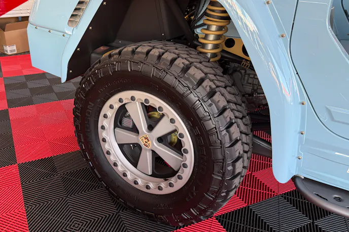 At the core of Lunatic Fringe is a completely hand-built metal body draped over a custom chromoly tube chassis, a structure fabricated by Colorado Sandcars. Nothing about it is restored or refurbished; the Thing’s iconic flat sides and upright shape were recreated panel by panel, refined with Porsche-like surfacing, and sprayed in Porsche’s classic 328 Gulf Blue. Even the wheels — a set of Curtis Speed beadlock wheels with a modern twist on the legendary Fuchs design — bridge the aesthetic gap between quirky VW military rig and Stuttgart sports car lineage. The result is a rig that looks familiar from afar but reveals an almost absurd level of detail the closer you get.