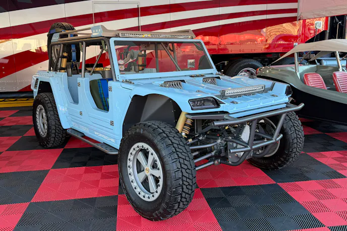 That philosophy resonated far beyond the shop’s walls. Lunatic Fringe first turned heads at the Grand National Roadster Show while still unfinished, hinting at the madness to come. Its full debut at the 2025 SEMA Show validated the hype, earning a spot in the SEMA Battle of the Builders Top 4. In a sea of high-dollar builds and high-horsepower showcases, the pastel Porsche-Thing mashup stood out — not because it tried to be the loudest or most extreme, but because it was executed with a level of vision and craftsmanship that felt genuinely original.