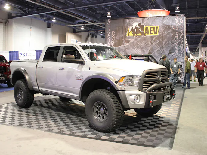 The large, silver 2014 Ram 2500 Crew Cab standing proudly in the center had drawn more than just our attention over the course of the week, and we caught up with Matt Felderman, marketing coordinator for AEV, to figure out why. Aside from the obvious reasons, like its sleek form-fitting fender flares and glossy wheels, there was more than met the eye when it came to this daunting diesel.