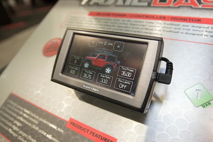 TrailDash is Superchips’ flagship product for the Jeep line. This product offers a variety of programming features available for Jeeps on other Superchips products, as well as serving as a touchscreen monitoring system for in-cabin display. In addition to displaying the typical PID information from the OBDII connector, the system also displays information such as an inclineometer. The information being viewed is fully customizable making the Trail Dash a versatile tool for Jeep owners who want to keep a close eye on their vehicle’s functions as well as update the performance and compensate for changes in tire size and differential gearing where it may affect the speedometer reading.
