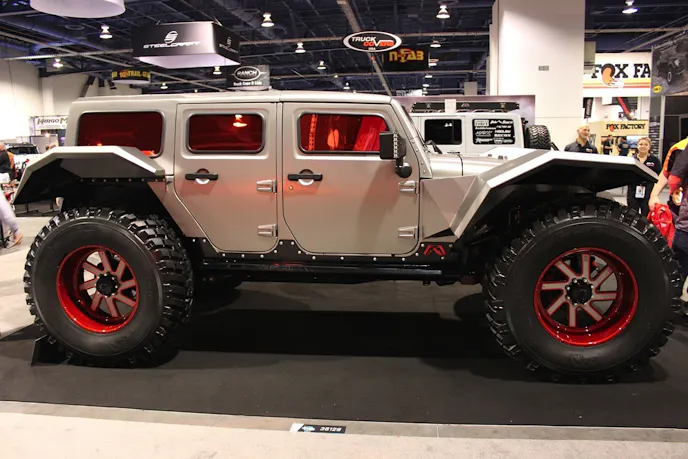 Taking up a good portion of the Fab Four booth was an attention grabbing ride that was so out of this world, it had us wondering whether or not it was even a functioning vehicle. To this, McGuire quickly added, “Our ‘Legend’ build is a Jeep JK concept with a chopped top, 50-inch tires, a polished exterior, and red window tint – and I actually rode in it recently.”