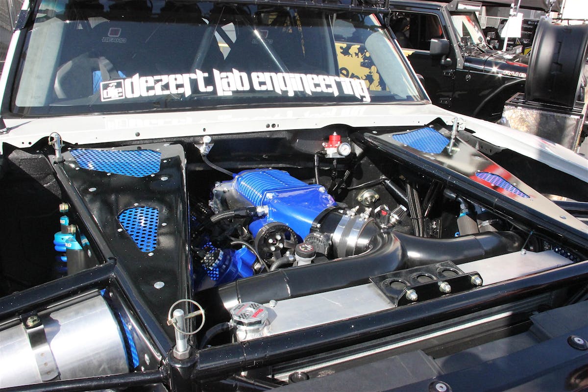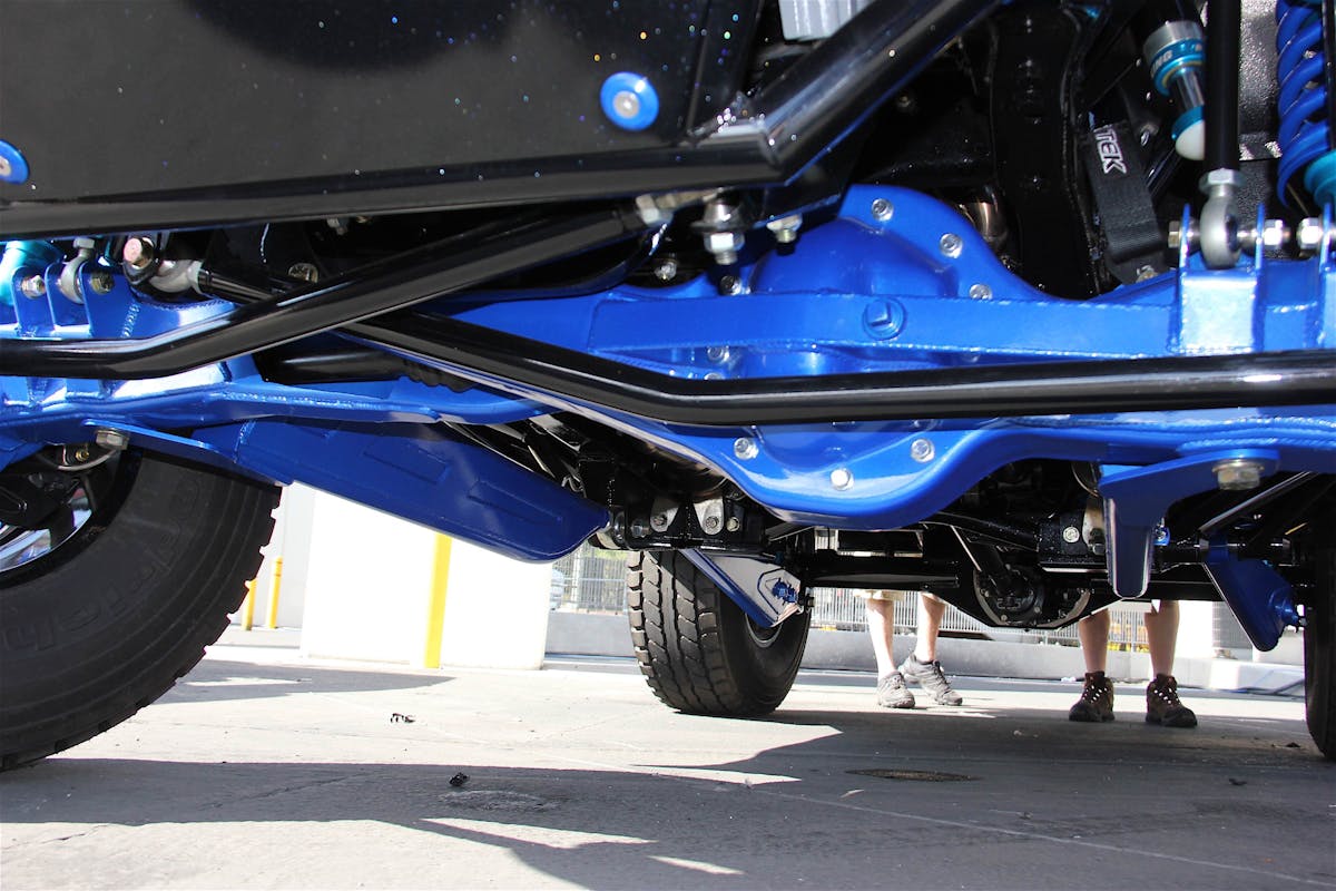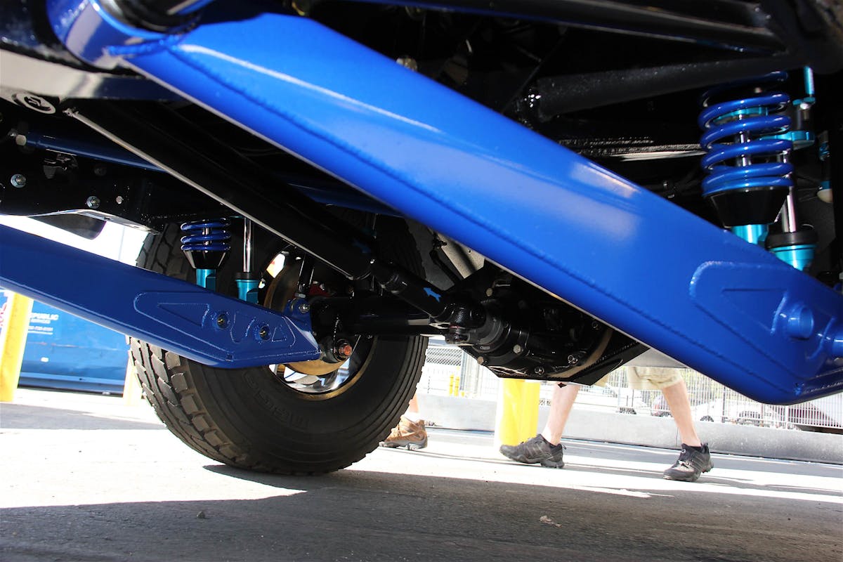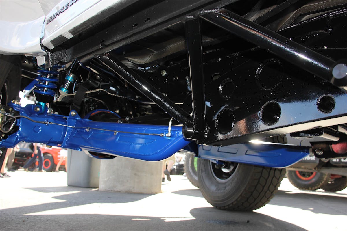 Dual UMP filters, custom billet valve covers, headers, custom exhaust keep the modifications coming under the hood. The 5.0-liter Coyote is backed by an RKL built 4L80 billet trans that will withstand all the abuse off-road.
