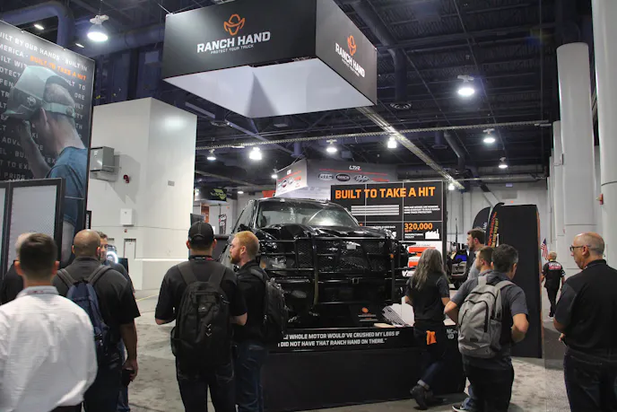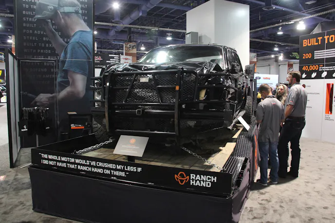 One of the most shocking and revelatory things we’ve ever seen at a SEMA Show was in the Upper South Hall this year. While most companies prefer to bring a gleaming, waxed-up truck or Jeep to showcase its products, Ranch Hand went the opposite direction, while still demonstrating what their signature bumpers could do.