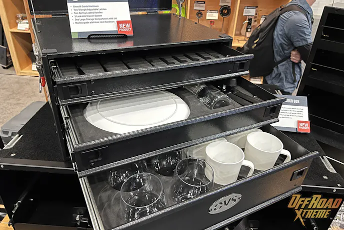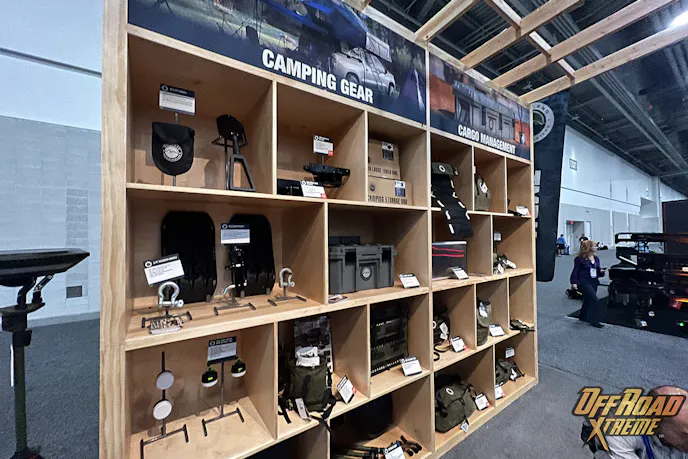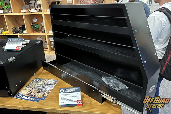 It appears Overland Vehicle Systems has mastered this arena with their CP Duty Glamping Products. I really liked what I would call a slide-out “pantry” storage system. The structure is tall and long, but narrow so it does not take a large footprint. It had three rows of shelving with bungee cord retention ropes to keep goods in place. Designed to be reversible, it can be configured for either the driver’s side or the passenger side of the vehicle.