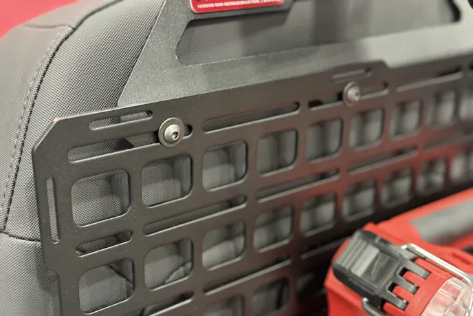 The seat-back mounting system is a standout. Dubbed the MOLLE seat back tech plate kit, this patented solution features a 16 x 23-1/2 inch block-and-slot panel made from 1/8-inch thick, powder-coated mild steel. What sets it apart is the no-drill installation, using tailor-fit brackets that secure it to the headrest post and seat frame. This means you don’t need to modify your seat to get a solid, reliable mounting system. Whether you’re strapping in up to 40 pounds of heavy-duty gear, long rifles, tactical pouches, or even a setup for keeping kids entertained on road trips, this seat-back storage system stays firm, preventing movement or wear on your upholstery.
