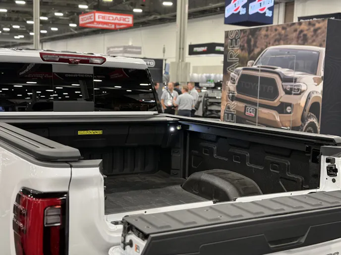 EGR’s slick RollTrac electric retractable bed cover is available for several vehicle models, and we got to see the cover installed on a GMC Sierra Denali pickup. It’s an aluminum bed cover with a 700-pound weight rating. It uses factory mounting points, which removes C-clamps from the mounting equation. For those of us who travel off the paved road, it’s important to note that the RollTrac electric retractable bed cover is engineered to withstand the abuse of off-roading. Another notable feature, from the off-road perspective, is the cover’s ability to retract without trapping dust and debris.