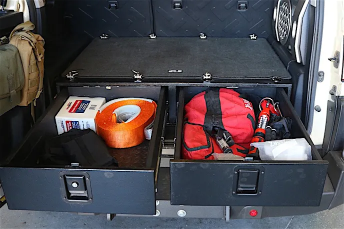 When traveling far off the beaten path, you need to be self-contained. Tools, supplies, and all types of gear need a secure home and Neil’s FJ can stow a ton of cargo. Storage bags attached to the rear tailgate hold a first-aid kit, machete, spare parts, and tools within easy reach. The rear compartment has a truck vault storage box with two lockable, sliding drawers. The truck vault is strong enough to pile heavy stuff on top without effecting the smooth operation of the drawers. Inside Neil stores recovery gear, larger tools, and survival supplies. The full length roof rack has a ton of space on top and also mounts a Hi-Lift jack, shovel, and a serious axe. Once at his destination, Neil can unload and then roll out the ARB awning; also attached to the roof rack.