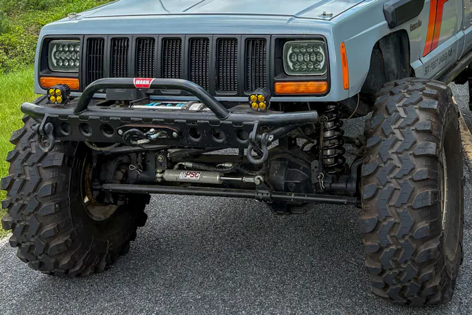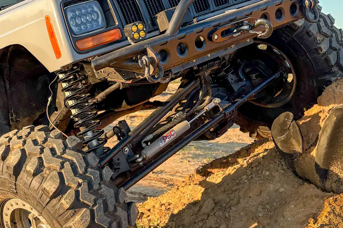 Under the hood is a tried-and-true 4.0-liter H.O. I6 pulled from the 1996 Cherokee XJ donor rig. Cooling is handled by the factory radiator, a custom fan shroud, and a trio of electric fans. The engine breathes through a low-buck snorkel, intentionally chosen so if it gets damaged off-road, replacing it is easy on the wallet. An Optima YellowTop battery supplies electrical power, and fuel is drawn from a 19-gallon Motobilt fuel cell.