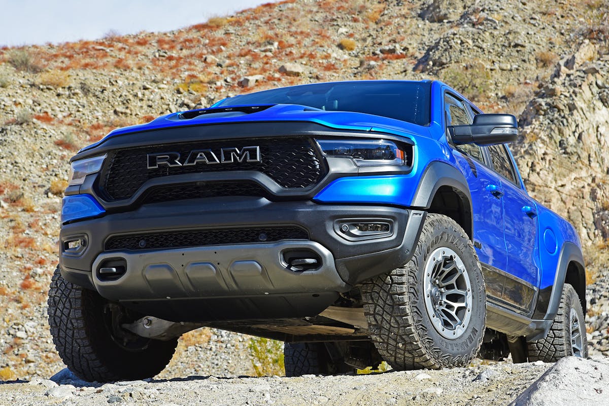 Three off-road driving modes are also part of the sophisticated 2021 Ram TRX drivetrain system. We got to know this trio better than the rest. Mud/Sand mode creates a torque split of 45/55 and manages engine power and throttle input to minimize wheel spin and improve traction, and it got used once or twice during our test. Rock mode was only implemented once when we came across a tight squeeze that also featured a rock-strewn axle-twisting approach. Accessed in 4Lo only, Rock mode recalibrated the rear locking differential and hill-descent control and split the torque 50/50. With help from a spotter and precise brake and throttle control on the part of the driver, we got through with no trouble at all.