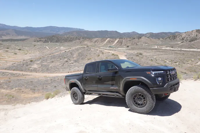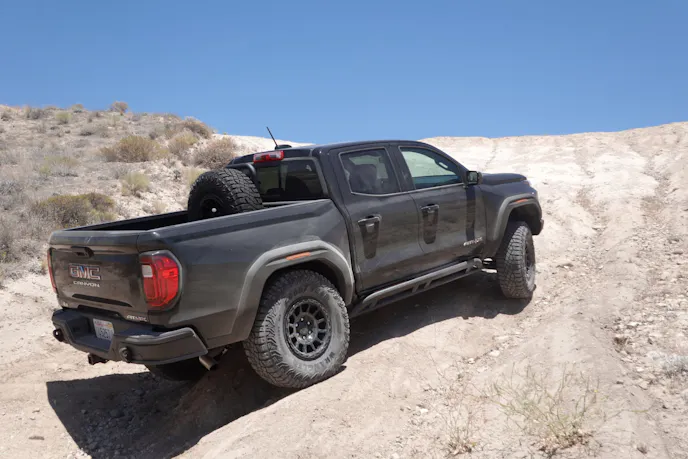 In a test of traction we headed to the steepest hill climb we felt comfortable attempting. We first tried low range with the differentials open, crawling as slowly as we could sawing the wheel. The Canyon dug in about three-quarters of the way up and ceased forward movement. Next, we locked just the rear axle and crawled slowly back up. The truck made it a few feet from the last little bump before losing traction again. Despite being essentially dug in near the top of this high angle slope, we engaged the front locker and surprisingly crawled the last few feet to the top.