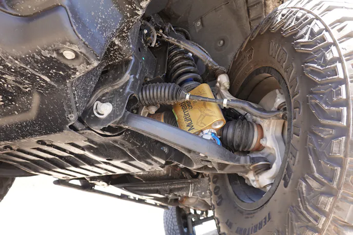 Turning back around, we hit that berm Dukes of Hazzard style and launched the truck a few feet into the air. Teeth clenched for the landing, we were bracing for some bad noises or at least a hard impact. But the result was the same—a well-damped landing at both the front and rear.