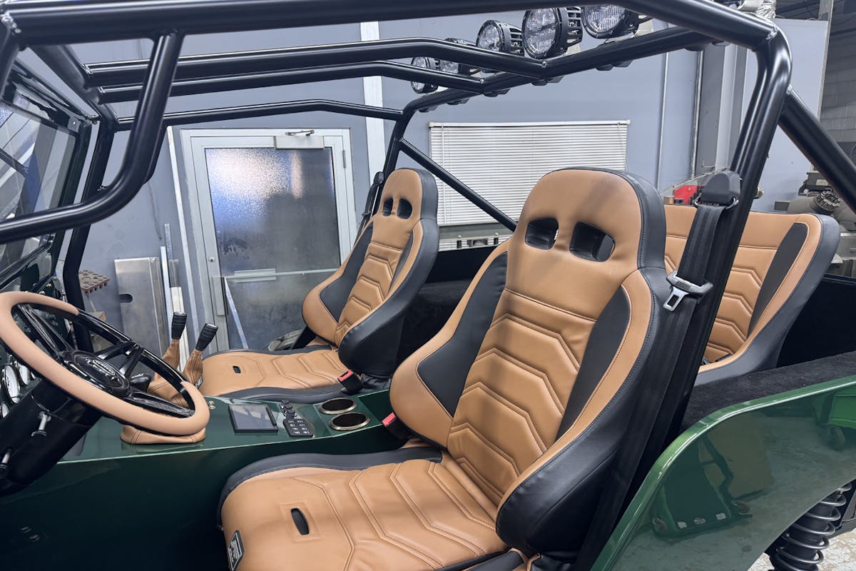 Of course, one of the most attention-grabbing aspects of the General is its body design. It resembles a Willys Jeep CJ-2A but is over 20 percent larger. Among other things, this increase in size results in improved leg and shoulder room. In fact, the overall body size is comparable to that of a two-door Wrangler JK. The General’s body is fabricated from 1/8-inch-thick aluminum, primarily 5051.