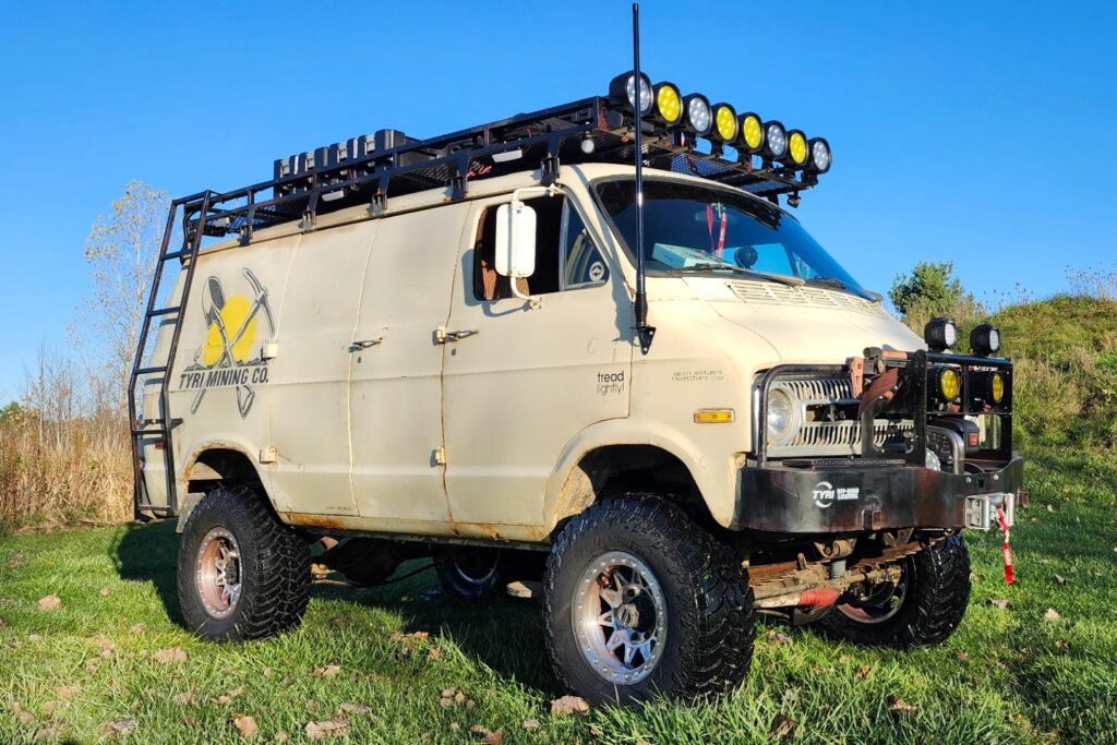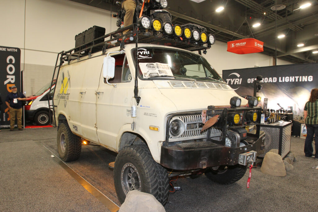 Along with mechanical upgrades, several new parts were added to the exterior to complement the vintage bolt-ons. The van’s old Ramsey winch was pulled and replaced with a Warn 8274. It sits on a new winch plate crafted to look as weathered as the front bumper. Other exterior touches include a ladder with rough-looking welds that match the era, an Unofficial Use Only rear rack, and a Power Tank system. The van also carries a full spread of TYRI lighting, and Eric notes that output tops 100,000 effective lumens. Finally, Alan Close of APOC Design finished the look with sharp TYRI Mining graphics and related logos.