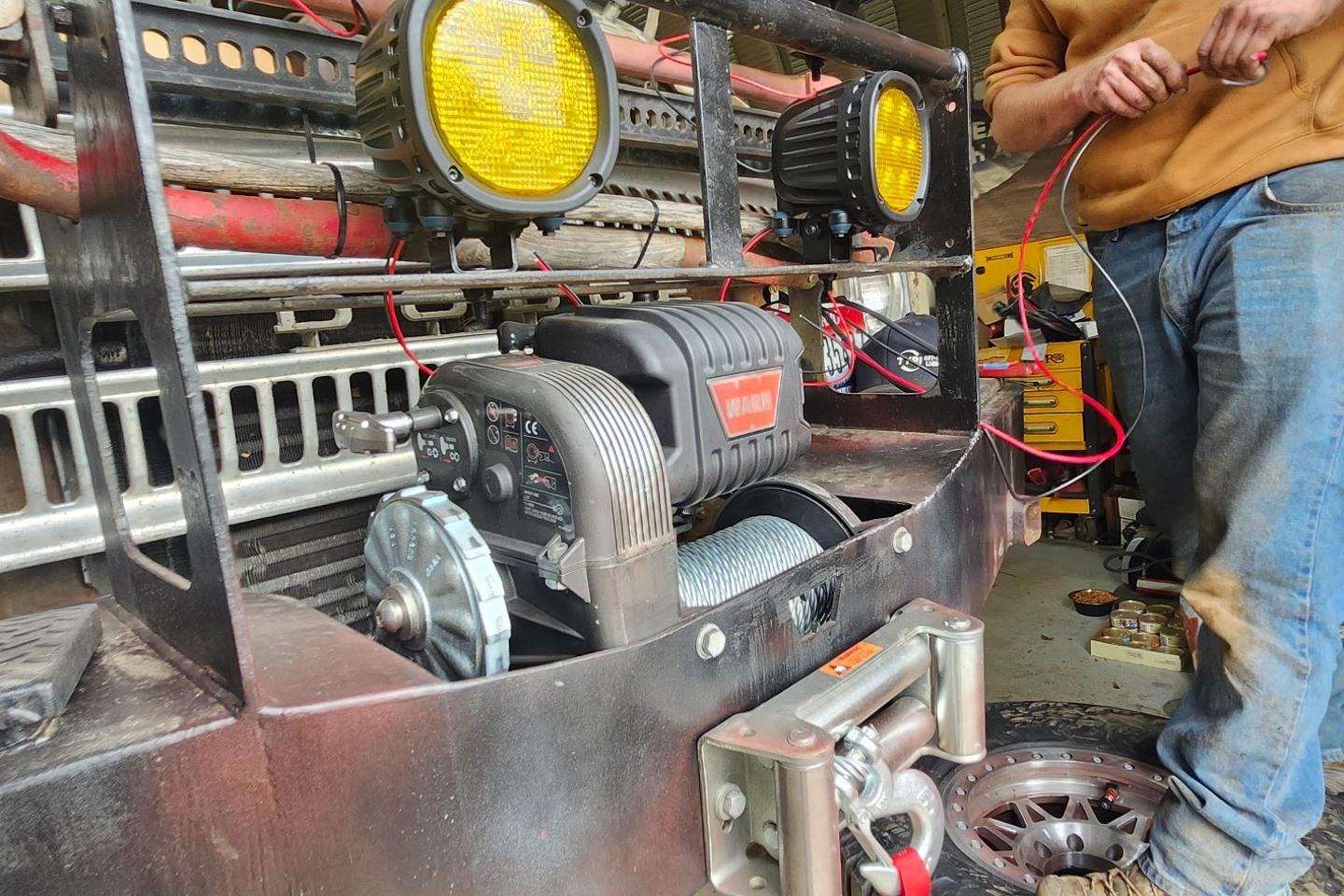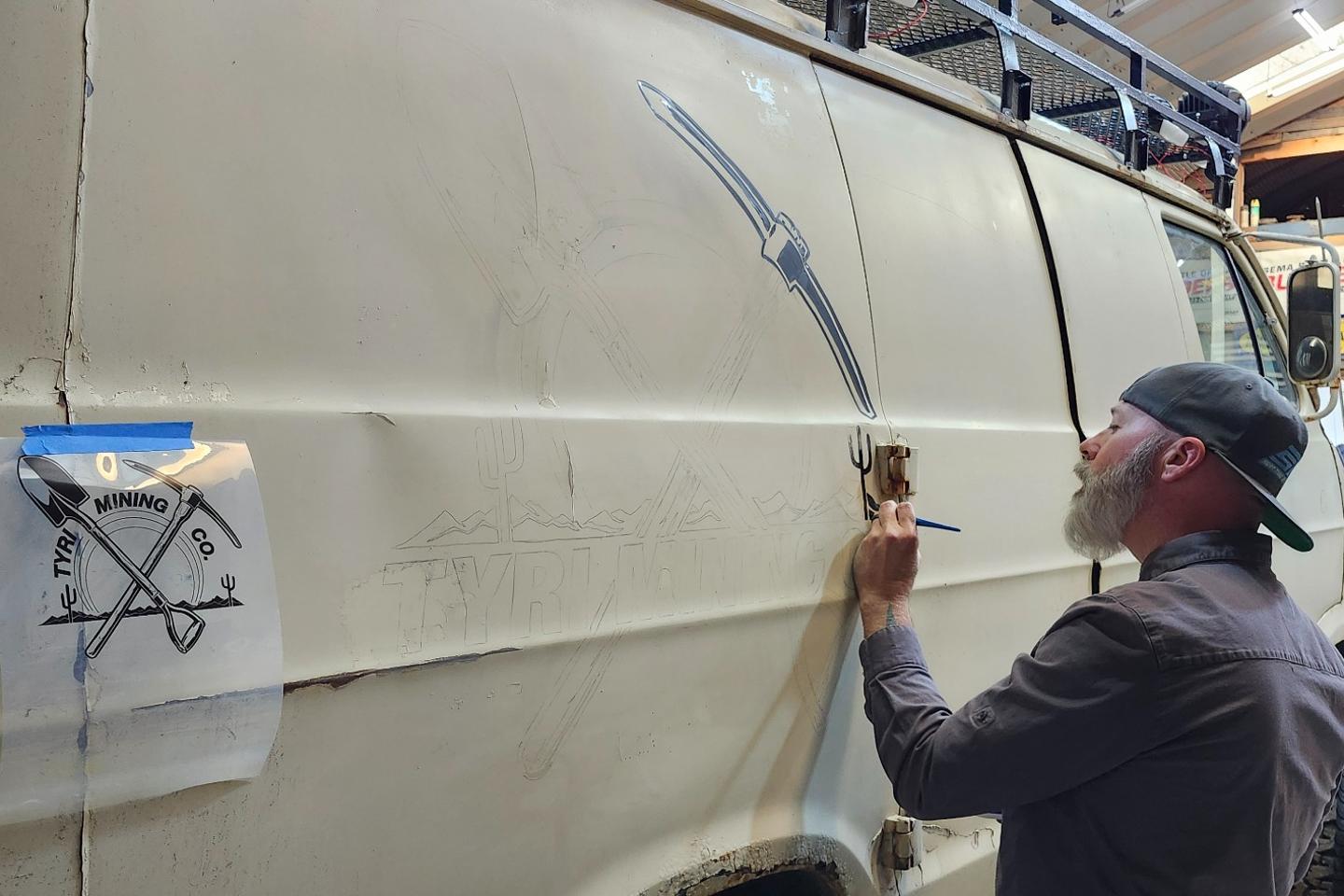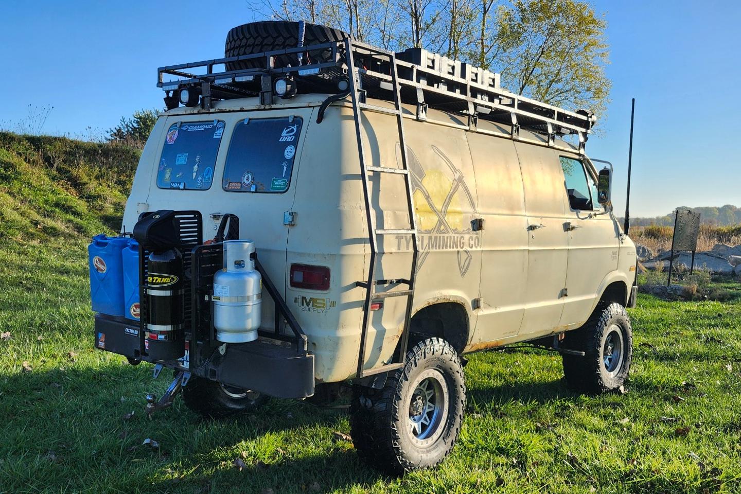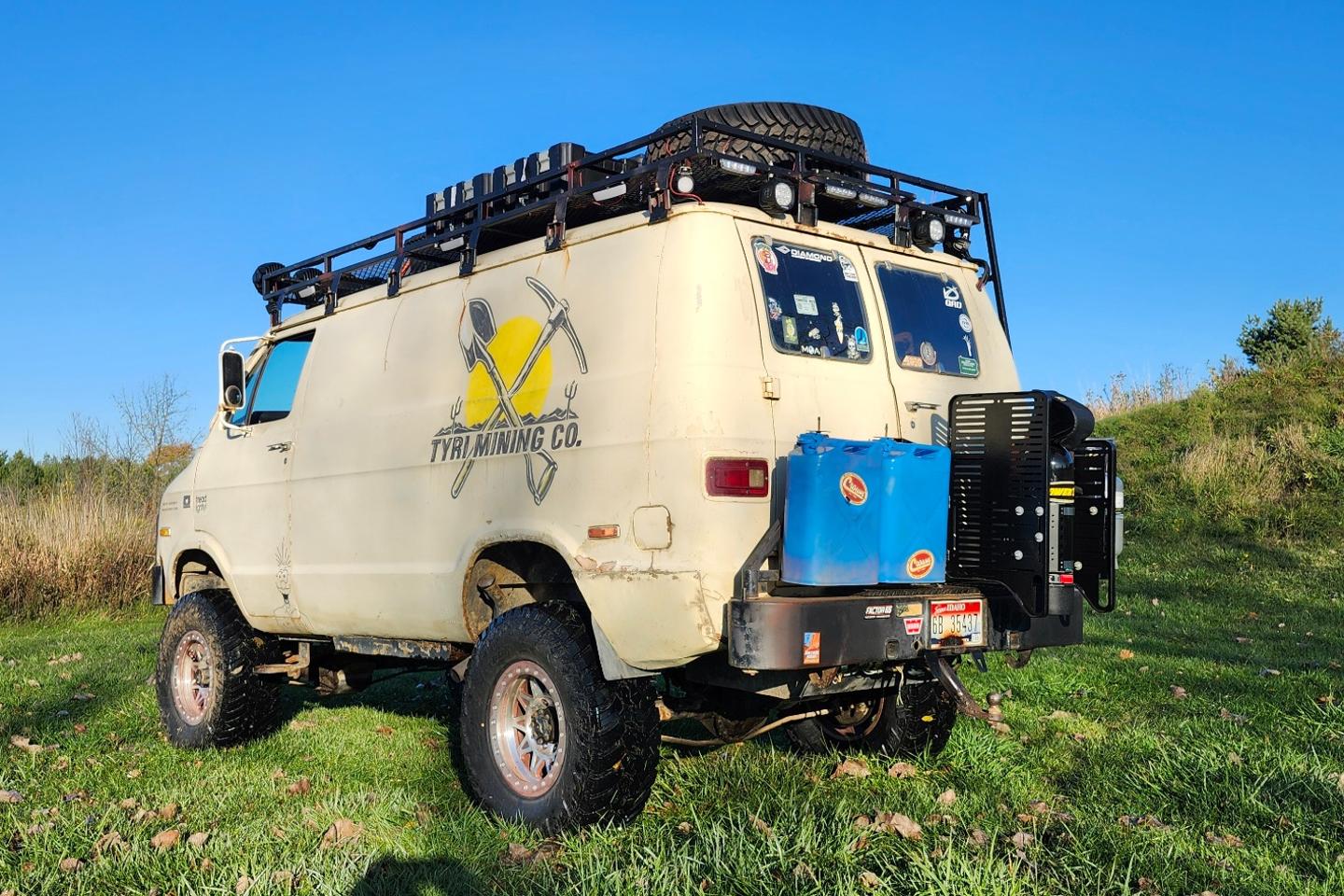 Along with mechanical upgrades, several new parts were added to the exterior to complement the vintage bolt-ons. The van’s old Ramsey winch was pulled and replaced with a Warn 8274. It sits on a new winch plate crafted to look as weathered as the front bumper. Other exterior touches include a ladder with rough-looking welds that match the era, an Unofficial Use Only rear rack, and a Power Tank system. The van also carries a full spread of TYRI lighting, and Eric notes that output tops 100,000 effective lumens. Finally, Alan Close of APOC Design finished the look with sharp TYRI Mining graphics and related logos.