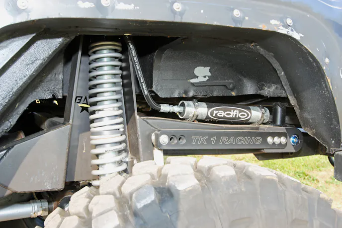 The 4Runner’s suspension is a three-link setup with 14-inch-travel Radflo 2.0 remote-reservoir coilovers. The coilovers feature custom shock valving and coil spring rates. Up front, Mark installed 4Wheel Underground three-link suspension brackets, but he made the link bars himself. The lower links are made from 2-inch-diameter solid aluminum, while the uppers are constructed from 1.75-inch-diameter, 0.120-inch-wall material. Each link bar is fitted with Ballistic Fabrication Ballistic Links.