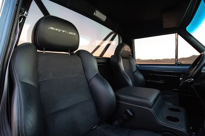 Inside, the truck uses the factory Viper gauge cluster and steering column. Passengers sit on SRT10 power bucket seats, and there is a custom leather-wrapped console and dash pad. Modern amenities abound and include power windows and locks, along with Old Air Products air conditioning. Other interior features include a Lokar transmission shifter, an audio head unit with Bluetooth, and push-button start.