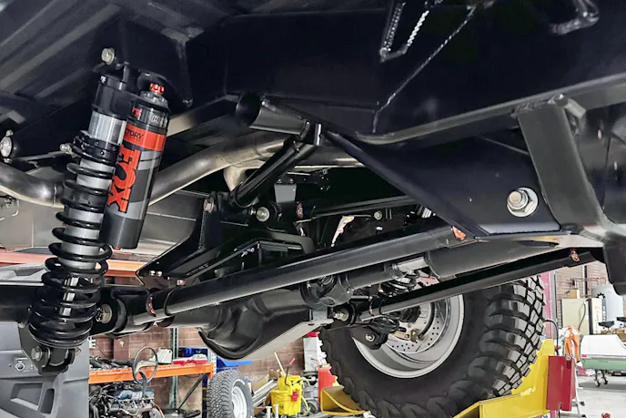 Suspension duties are handled by Fox 2.5 Factory Series coilovers, which lift the truck roughly 3 inches over stock. The front coilovers provide 10 inches of travel, while the rears deliver 12 inches. Suspension geometry consists of a parallel four-link up front and a triangulated four-link in the rear. All link bars are adjustable and fitted with RockJock Johnny Joints.