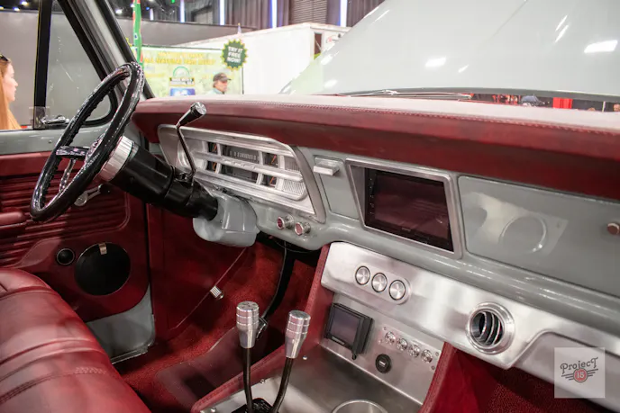 The attention to detail carries straight through the exterior and interior. Outside, the truck wears a 1968-model grille, and the bed stake pockets have been shaved and filled. The radio antenna hole and original fuel fill neck were also filled. Fuel is now routed through a filler neck inside the bed that feeds a relocated rear-mounted tank. Steele Rubber Products weather stripping is used throughout. Fun fact: Steele sponsored the truck in the 2025 SEMA Battle of the Builders Young Guns competition, where it finished in the top ten.