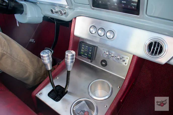 Inside, the truck is finished with a full Morgan’s Auto Trim interior to include a bench seat, door panels, dash pad, headliner, and sunvisors. Highlights include a Restomod Air A/C system with a custom vent valance, a custom center console, and a billet gauge cluster. A trio of buttons controls the A/C system, joined by a Holley Terminator X display, a quartet of accessory switches, and an IDIDIT tilt steering column. Audio duties are handled by a Kenwood head unit feeding five speakers.