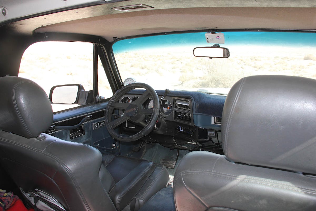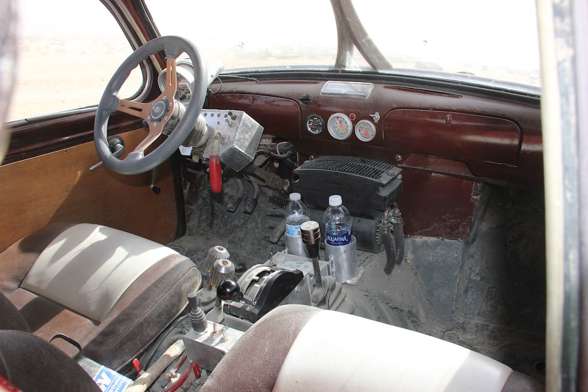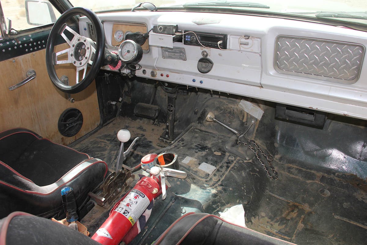 Suspension on the Fiat is comprised of Sway-A-Way 2.5-inch air shocks, as well as Fox 2.0 bump stops and shocks with 16 inches of travel. Steering is four-wheeled, with a Stazworks electric pump out back. The engine sits partially past the firewall, such that the rearmost spark plug is accessible only from inside the cab. A Warn 9,000-pound winch sits up front, ready to pull John out at a moment’s notice. He even has an 8,000-pound winch in the rear, next to the custom-made fuel cell.