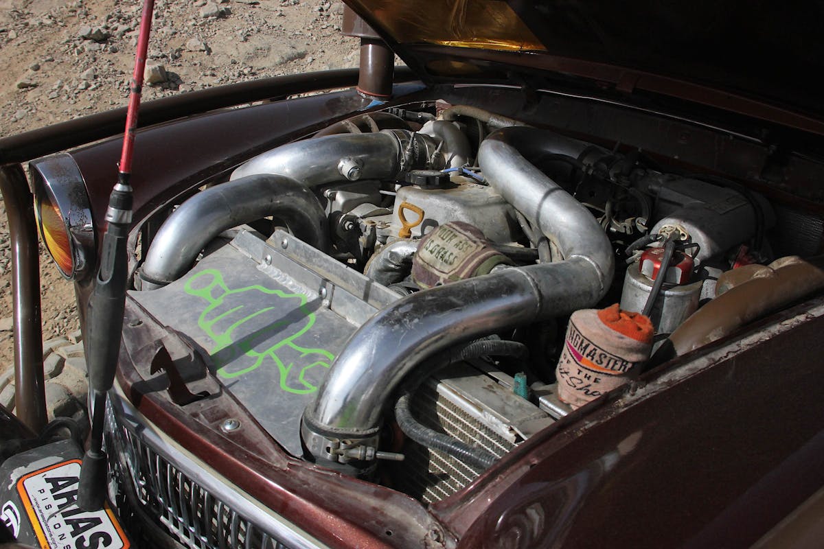 John ripped out the stock 1.1-liter inline-four and replaced it with a 2.7-liter turbocharged Toyota 3RZ. He went so far as to make his own fuel injection system from a Honda setup, as well as a handmade intake manifold. “It makes about 550 horsepower,” said John, without blinking an eye. The power goes to two Unimog four-ton portal axles, increasing the ground clearance of the car by a significant degree.