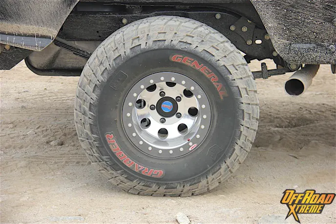 The rearend was made by Tubeworks in Riverside, California, with a four-linked back half and Fox external reservoir shocks and King bump stops. Mazzulla Offroad front end suspension gave the truck plenty of shock travel, too. 37-inch BF Goodrich Baja T/A KR2s put the power to the ground, one on each corner and two more strapped to the bedcage.