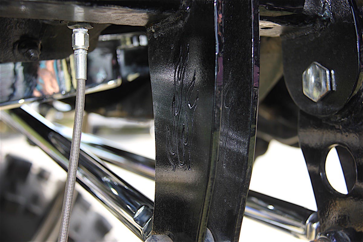 Flames are a motif of Henry's Chevy. They appear near the frame rails, wheel wells, the fenders, and other curious spots.