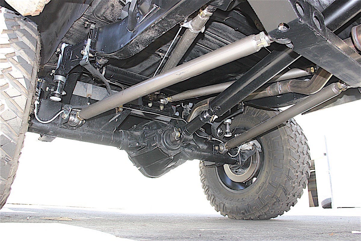 Powering the Money Pit is a 5.7-liter Hemi V8 and a T400 transmission. The transfer case is an Atlas race unit. Driveshafts were supplied by Tom Woods. Each of the Rockwells has Ouverson axle shafts. With all of that beefed up power, braking has to be stout, too; hence the F-650 16-inch rotors and F-350 brake calipers. Cooling is handled by a Griffin radiator back-to-back against a Fluidyne transmission cooler.