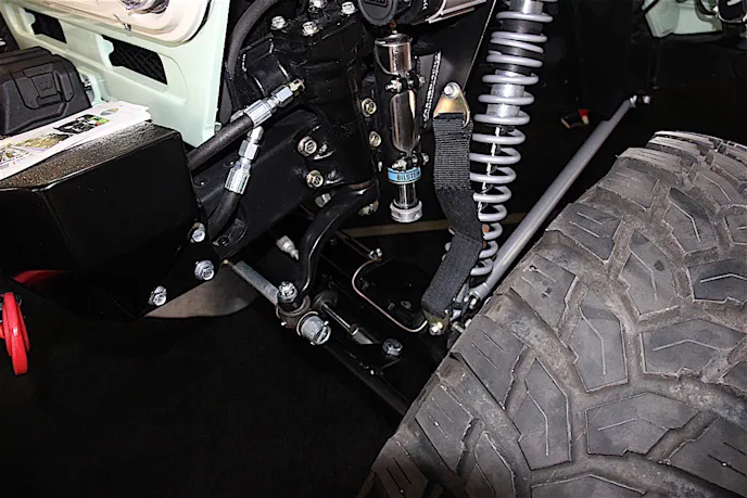 Suspension is obviously from Bilstein. 14 inches of travel on all corners give the vehicle plenty of articulation. The interior has genuine Toyota bucket seats covered in leather. It also has a decent stereo system from {link=https://www.retromanufacturing.com/}Retro Manufacturing{/link}.