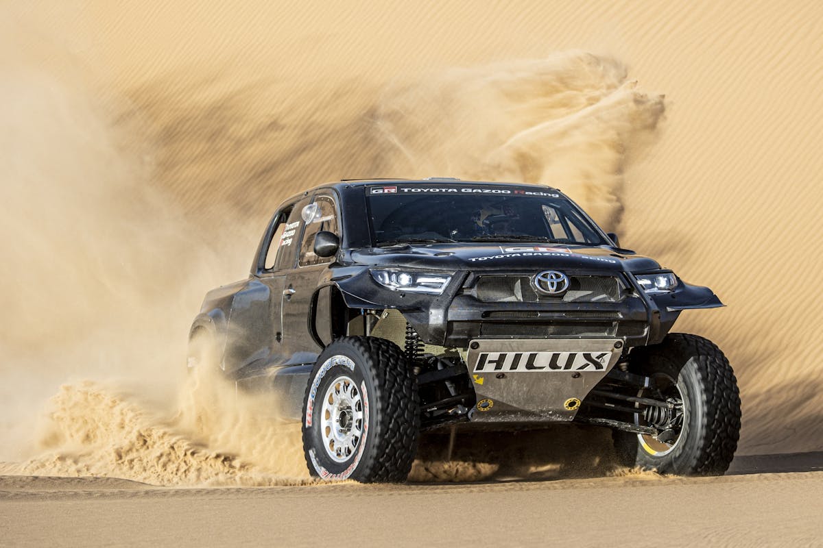 Toyota had to update its Hilux rally buggies to meet the new regulation changes. In addition to the new engine, the truck also gets more suspension travel and rides on larger 37-inch tires with 320 mm wide tread.