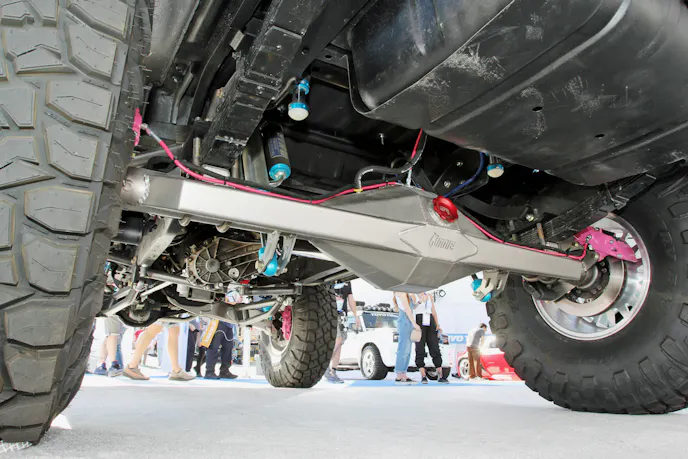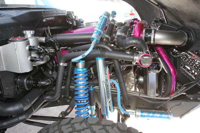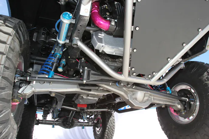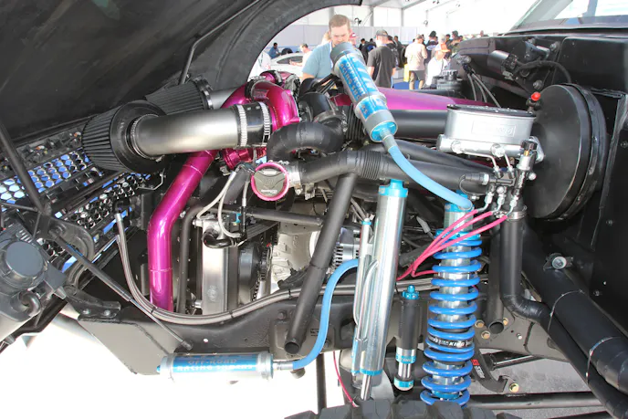 Up front, the Twin-Traction Beam frontend runs an Eaton Detroit Truetrac limited-slip differential. The Solo Motorsports TTB beams are cut and turned for proper alignment, and they widen the track by 4.5 inches per side. Stopping power comes from a Wilwood braking system with six-piston calipers. The suspension list is stacked, highlighted by a Solo Motorsports Stage 5 kit with 12-inch-travel King 2.5 remote-reservoir coilovers, 12-inch-travel King 2.5 three-tube bypass shocks, and King 2.0 compact bump stops.