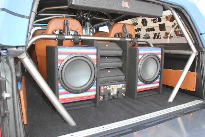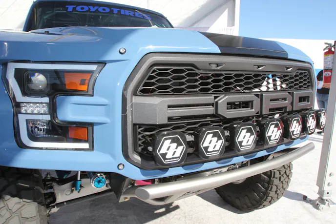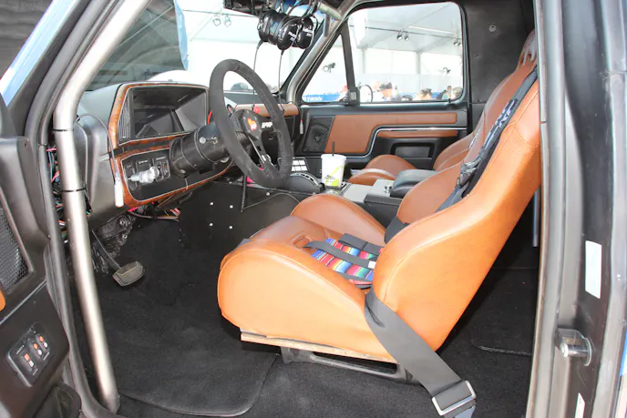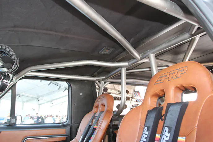 Inside, the Bronco packs a Solo Motorsports rollcage and an Old Air Products Hurricane 2000 Series A/C-heat combo. A trio of PRP gear steps things up with the company’s steering wheel, XCR front and rear seats, and five-point harnesses. Rugged Radios intercoms and headsets join the mix, along with an M1 race radio. Capping it all off is a massive JBL sound system.