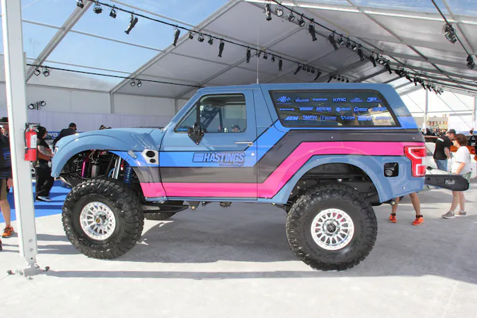 Out back, the Bronco packs a 72-inch Currie Enterprises custom 9-inch with an F9 centersection, Currie Pro Nodular Iron third member gear case, and spool differential. Other features include a 46-inch back brace for the 3.5-inch-diameter axle tubes, 40-spline axleshafts, and a pinion support. The rear suspension includes a Solo Motorsports Stage 5 kit with Deaver Q80 leaf springs, 12-inch-travel King 2.5 three-tube bypass shocks, and King compact bump stops. Four-piston Wilwood calipers, rotors, and brake lines round it out.