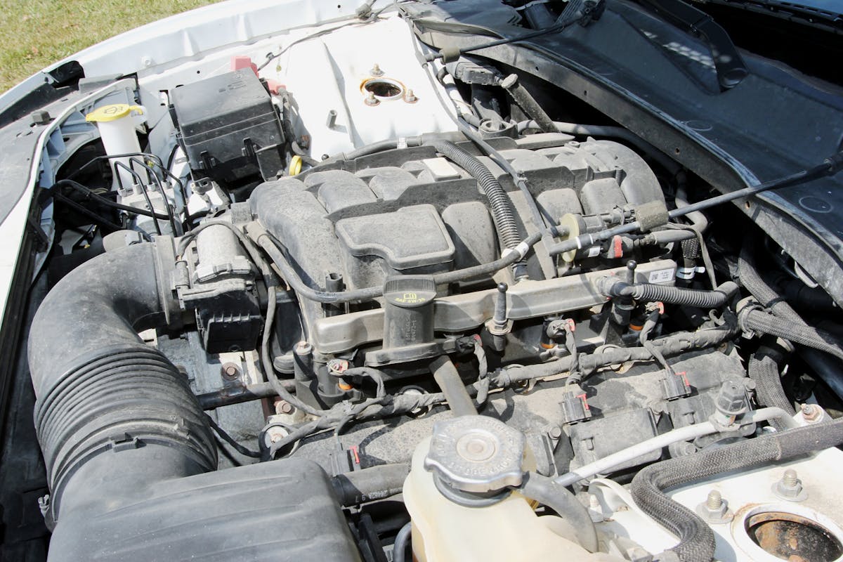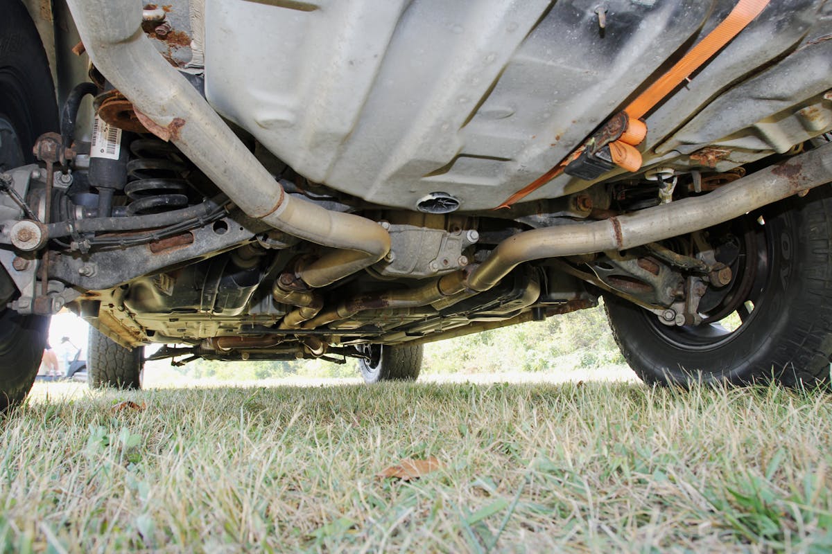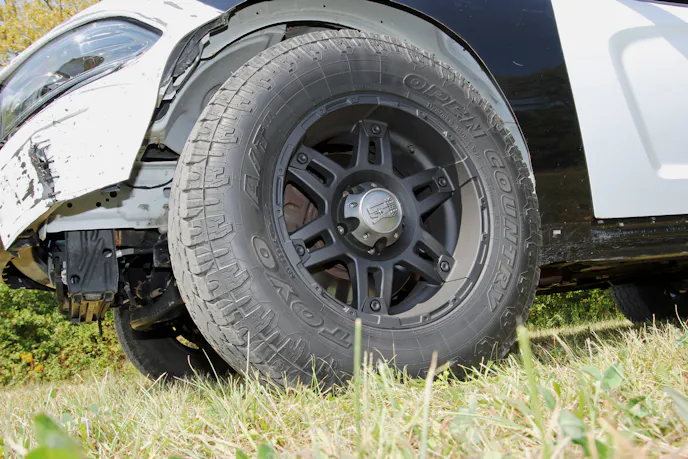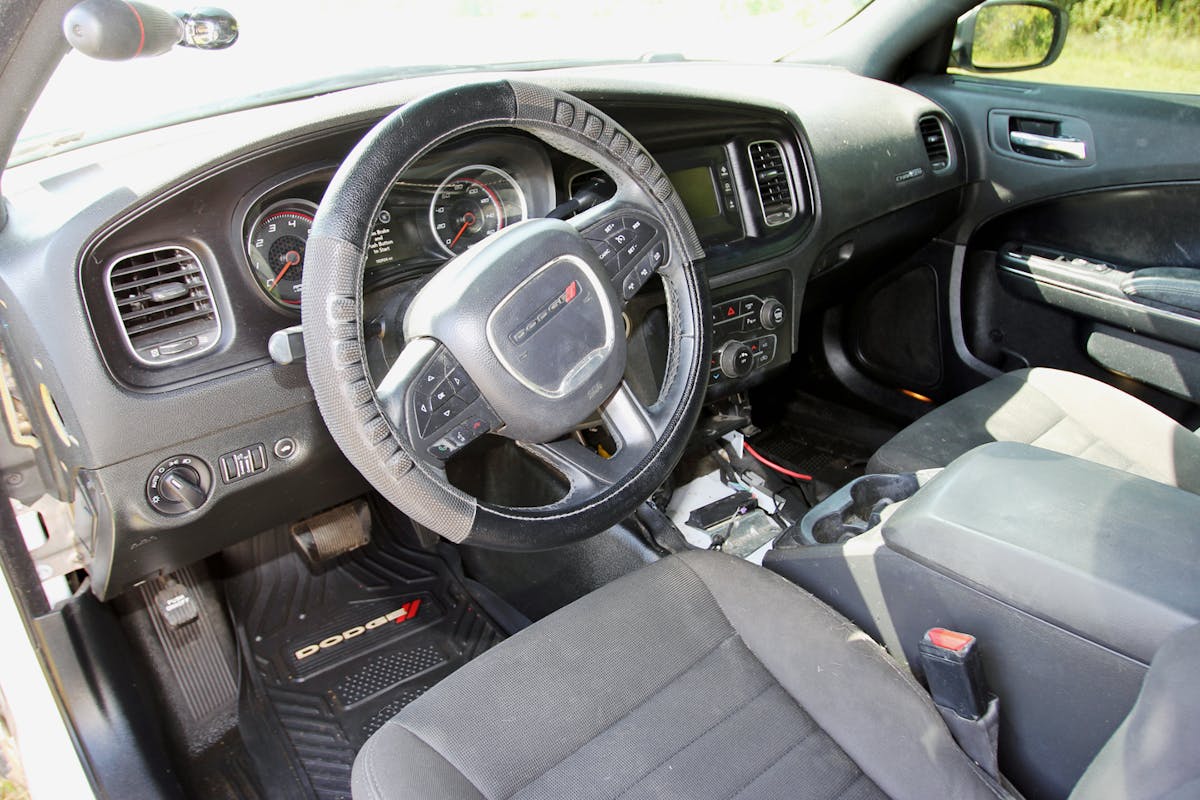 The Charger Pursuit is powered by a 5.7-liter HEMI V8. According to Stellantis press material from 2017, it produces 370 horsepower and 395 pound-feet of torque and includes severe-duty engine cooling. Erica left the engine untouched but added aftermarket mid-pipes and resonators to give it more growl. Power runs through the factory five-speed AutoStick automatic transmission to a BorgWarner 44-40 transfer case. The front and rear differentials are stock, with 3.07:1 gears. Pursuit-package heavy-duty four-wheel disc brakes rein in the Charger’s forward momentum. It also features Pursuit-package performance steering with a cooler.