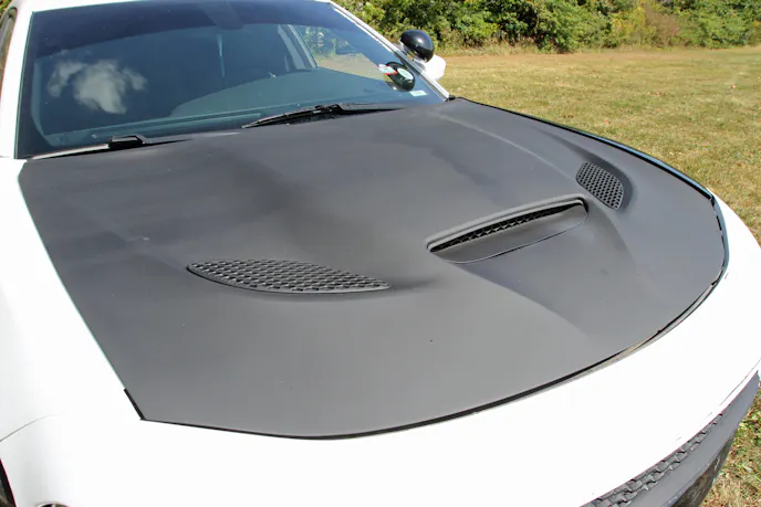 The pair went to work on the Charger Pursuit. Ultimately, they replaced the bent control arm, along with all four doors (fitted with factory ballistic panels), the trunk lid, and the rear bumper cover. They also swapped out the taillights, driver-side fender, and headlights. The crumpled factory hood was replaced with an aftermarket Hellcat-style hood featuring functional scoops, and a spoiler was added out back. They also sourced bullet proof glass to replace the cracked glass. However, Erica wanted the car to resemble a “wasteland” police vehicle similar to those found in the Twisted Metal video game (note the “Twisted” license plate). For that reason, some damaged body parts were deliberately retained.
