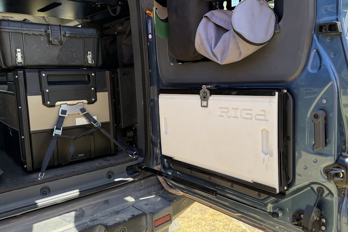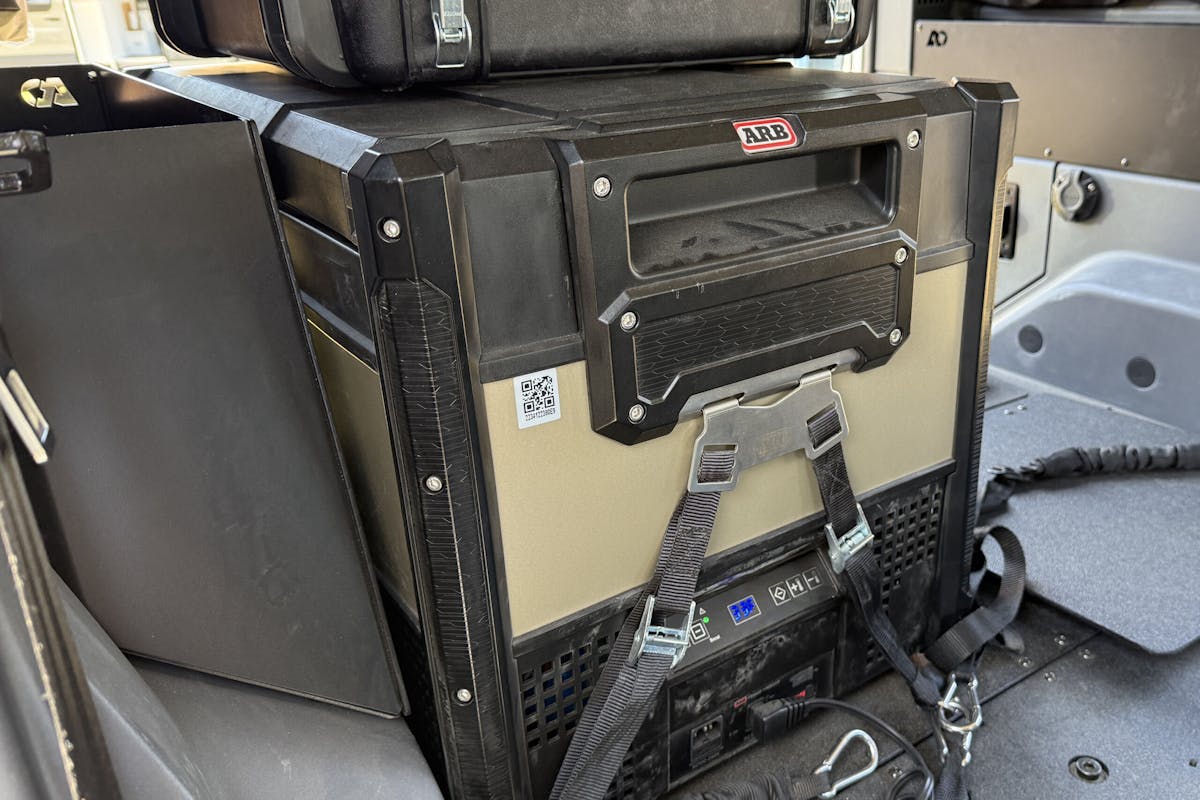Electronics include a Switch-Pros overhead mount and along with the Switch-Pros system and touchscreen display. The factory rearview mirror has been swapped out for a Wolfbox G900Pro touch screen smart mirror, which includes an integrated dashcam. A Victron Cerbo GX system allows for remote monitoring of the vehicles electronics (along with fuel and water tanks if so equipped) while a GX Touch 50 screen is utilized for in-cab monitoring. A 200 amp-hour Victron lithium battery keeps everything powered up. An ARB Twin Onboard Air Kit is also mounted under the rear seat and an ARB fridge/freezer keeps lunch and beverages fresh.