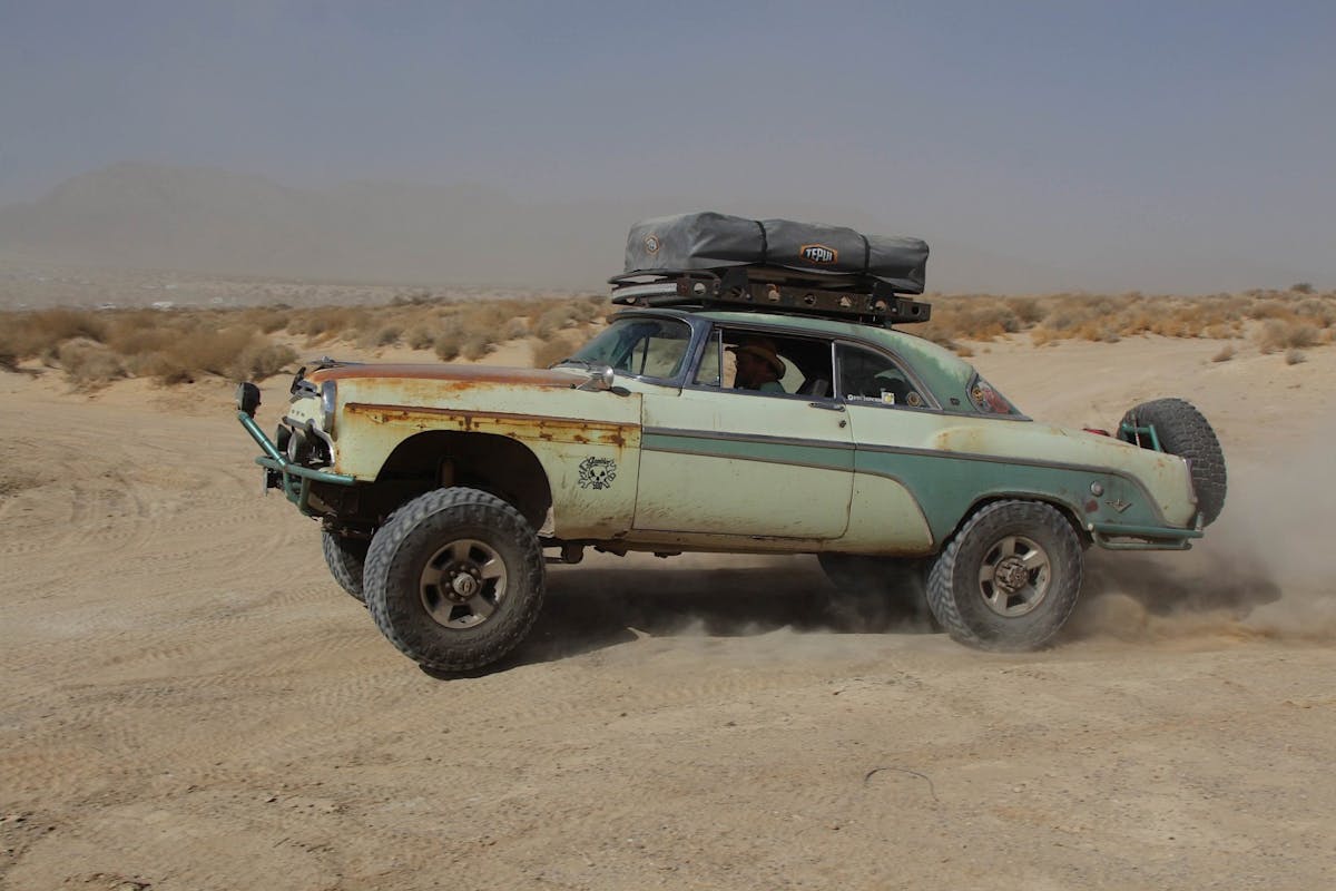 I spotted Dave’s lifted coupe rambling around the lake bed on Saturday. Against the strong winds and clouds of dust floating around, he and a friend were defying nature with windows down and spirits high. I hailed Dave down as soon as I saw the distinctive teal bumper and faded exterior.