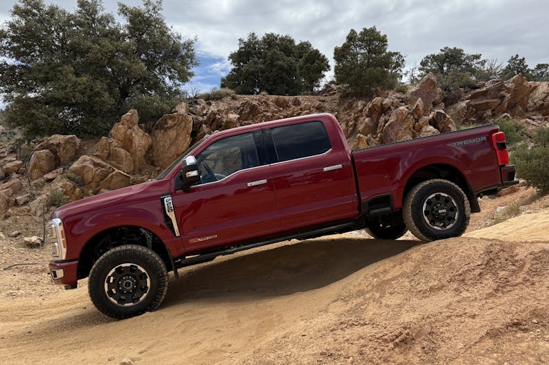 For a truck of its stature, we were genuinely impressed with how capable the 2025 Ford F-250 Super Duty Tremor is off-road. There’s hardly an obstacle that this truck can’t master, depending on your tolerance for body damage risk, anyway. Engage low-range and Rock Crawl mode and the truck simply idles along over any boulder in the way. The truck is comfortable on loose and rutted trails, makes easy work of graded dirt roads, and dispatches sandy hills with ease. Traction offered by the truck’s 35-inch tires, rear locking differential, and front limited-slip differential, combined with the immense torque, make this truck nearly unstoppable.