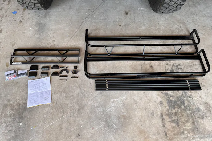 The main rack structure itself consists of one front section, one rear section, one hardware kit, and two side rails that connect everything together. Additionally, this kit includes six bars that make up the roof rack flooring.