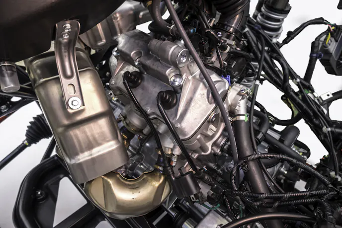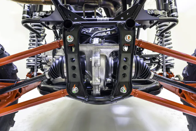 The Talon 1000R reportedly shares 85 percent of its parts with the Talon 1000X. It has both the both engine and one-piece frame at the center. At 68.4 inches across, it sits a full 4.4-inches wider than its 1000X brethren, and its wheelbase has been stretched a full five inches for greater suspension articulation.