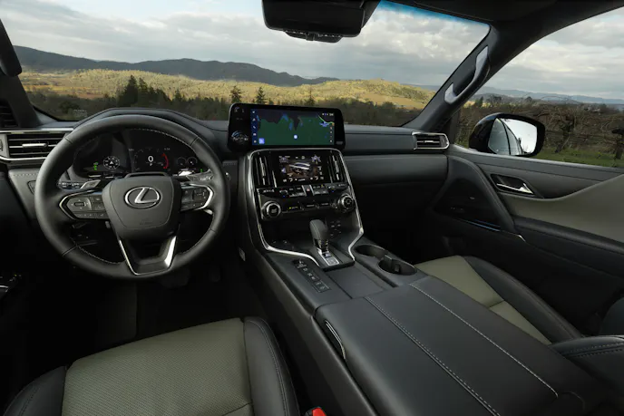 The Lexus LX 700h can be configured with either two or three rows of seating. The LX is offered in several other grades: LX 600 Premium, LX 600 Luxury, LX 600 F Sport Handling, LX 700h Luxury, LX 700h Ultra Luxury, and LX 700h Sport Handling. All models include Active Height Control, Adaptive Variable Suspension, Multi-Terrain Select, and Multi-Terrain Monitor. Additionally, there are Downhill Assist Control, Drive Mode Select, and Crawl Control with Turn Assist. Crawl Control engages and disengages engine output and hydraulic braking pressure to help reduce tire slippage. Turn Assist decreases the LX’s turning circle by adding brake force to the inside rear wheel.