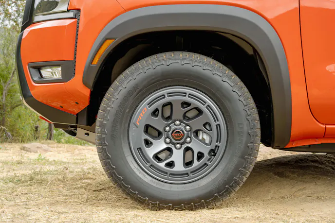 So, what’s new on the 2025 Nissan Frontier? Well, the exterior has a revised front fascia, grille, and bumper design. To us, looking at the Frontier PRO-4X photos provided at the time of publication, the most obvious change is the removal of the Frontier badging along the top of the grille. It’s replaced by a trio of sculpted visual elements that resemble air intakes. There’s also a new tailgate finisher for the two-wheel-drive PRO-X and four-wheel-drive PRO-4X models. And speaking of the PRO packages, they get a new wheel design. Compared to the previous standard PRO wheels, the new 17-inch wheels eschew all polished aluminum for a painted surface. The new wheels look good, though we wonder how much water pressure it’ll take to coerce dirt and mud out of the slats that encircle the outer edge of the wheel.