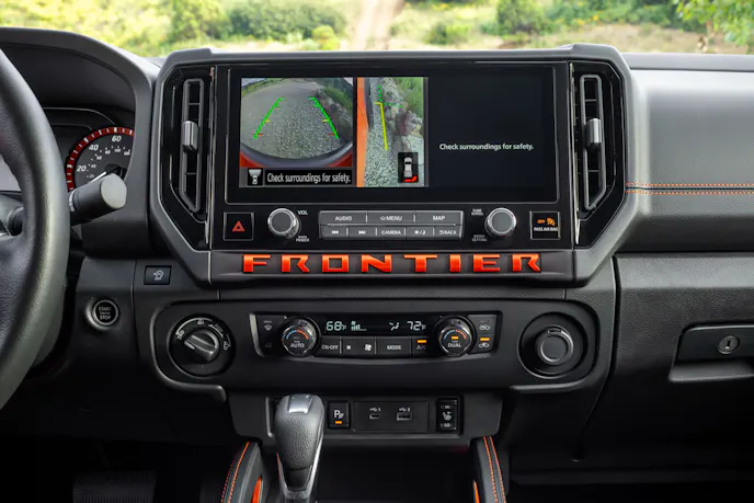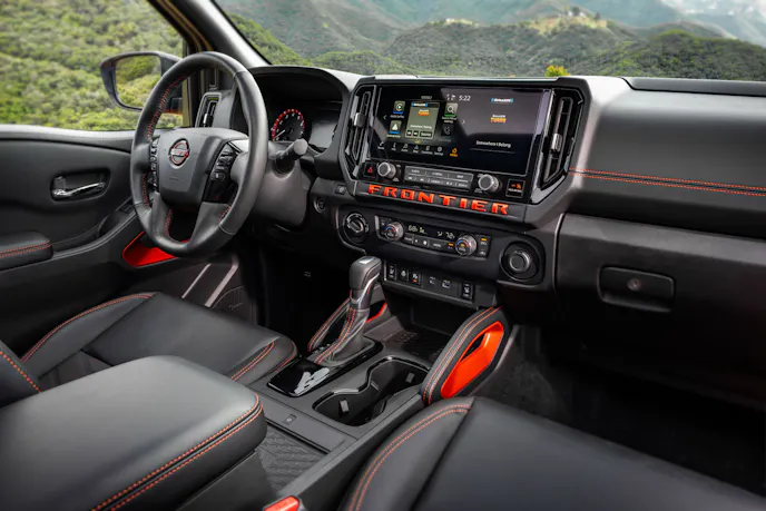 Inside the 2025 Nissan Frontier are several upgrades. A telescoping steering wheel is standard, and a four-way power passenger seat is standard on PRO-X, PRO-4X, and SL grades. Two-way power lumbar for the six-way power driver seat is now standard on SV grades and higher. Furthermore, there’s a larger 12.3-inch touchscreen, and the Intelligent Around View Monitor with Enhanced Off-Road View camera now works at speeds of up to 12 mph. This allows the system to help drivers spot obstacles at typical off-road speeds in technical terrain.