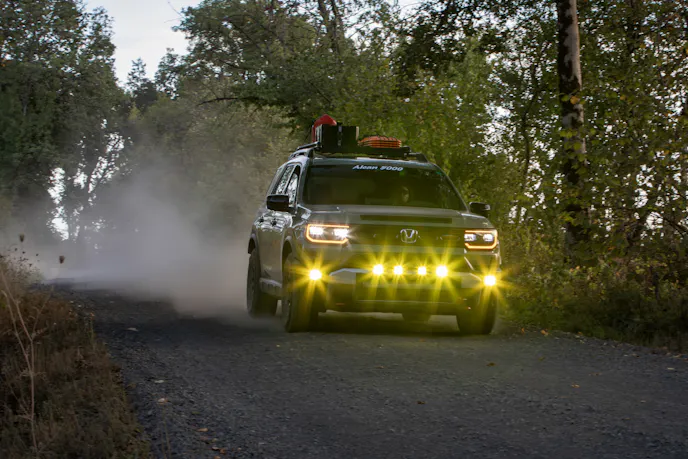 For this rally, the Passport remains mechanically stock, but Honda has outfitted it with a lineup of factory accessories to boost adventure capability. These include rock sliders, and aluminum front scuff plate, black accessory wheels with a full-size spare, a cargo roof platform, MOLLE boards, and a black hood decal. Lighting upgrades come from Baja Designs, with a prototype rally light bar mount developed by Rally Innovations for better visibility in harsh conditions.