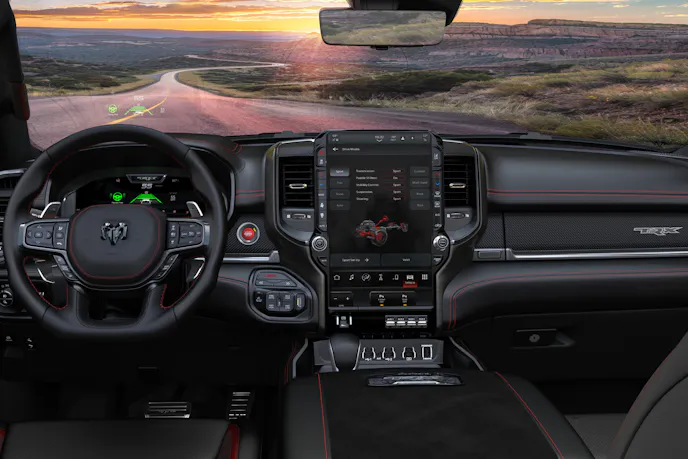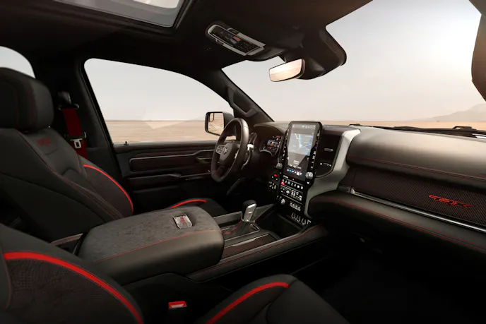 A dual-pane, power-operated sunroof is standard. Ram also notes that, for the first time, TRX features a leather-wrapped airbag cover with red stitching and a full suede headliner and visors—details typically reserved for flagship luxury trims.