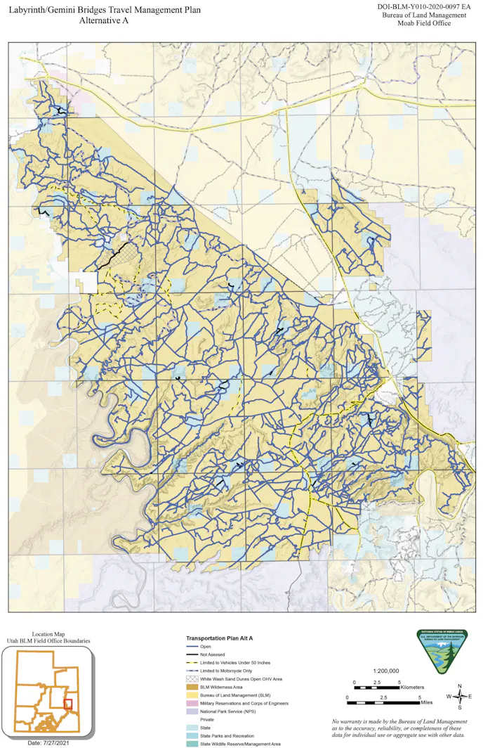 The Labyrinth Rims / Gemini Bridges travel management area covers 303,993 acres in Grand Country and has 1,232 miles of inventoried routes on BLM-managed lands. 437 miles of trails are under review for full-time motorized vehicle closure.