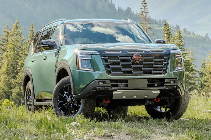 Add to the list a reshaped front fascia to improve approach angle, metal underbody skidplate, and 275/60R20 (33-inch) all-terrain tires. Consequently, the Armada PRO-4X has a maximum 9.6 inches of ground clearance, an approach angle of 33 degrees, departure angle of 24.5 degrees, and a 25.5-degree breakover angle. All of this is respectable, though we’d personally prefer the 2025 Armada’s available 18-inch-diameter wheels instead of those 20s.